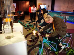 Wenn man in die Pedale tritt, beginnt sich der Zylinder mit Wasser zu befüllen - doch wer schafft es zuerst den Zylinder voll zu bekommen?
